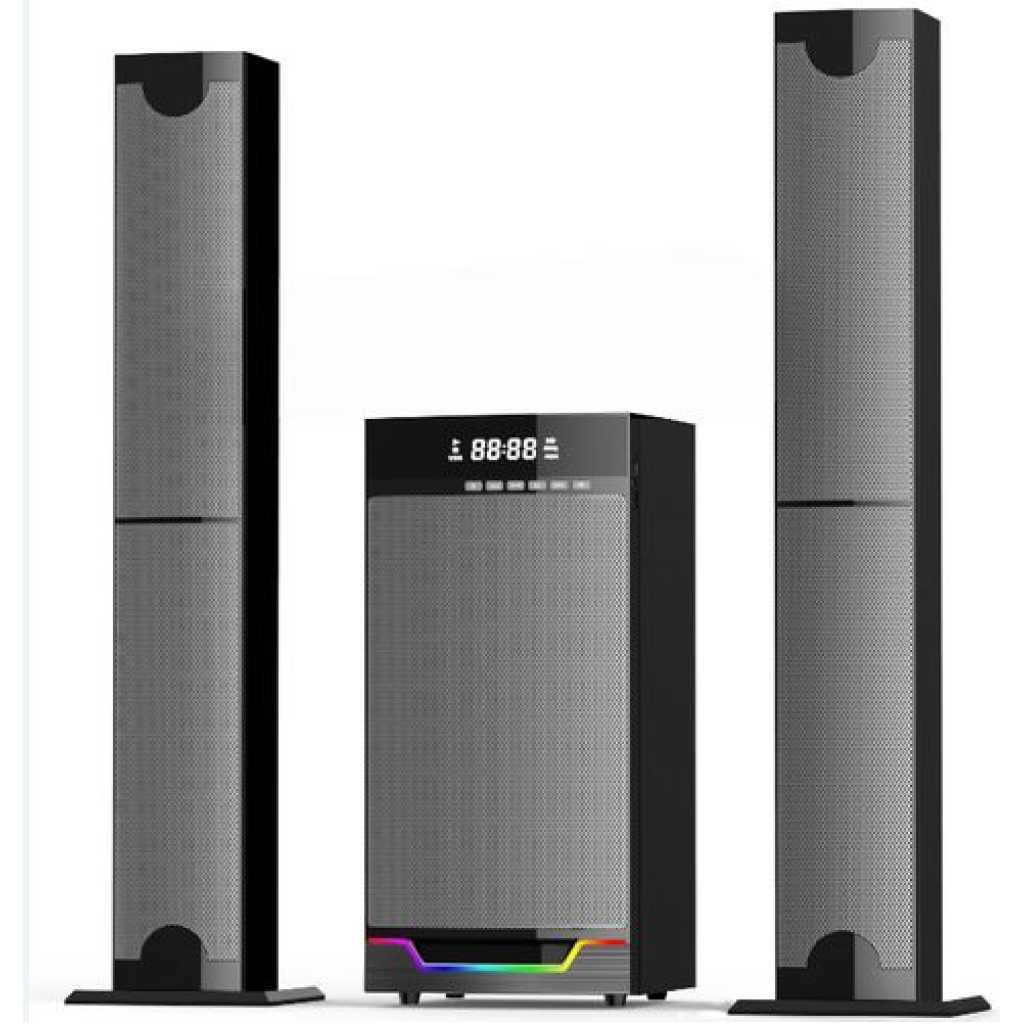 Room-filling 4.1-channel system with a punchy powered subwoofer and four satellite speakers for immersive music and movies. Stream via Bluetooth, or play from USB/SD; there’s FM radio, AUX input for TVs/decoders, and a handy remote control with bass/treble adjustment. Great for living rooms, hostels, and shops.