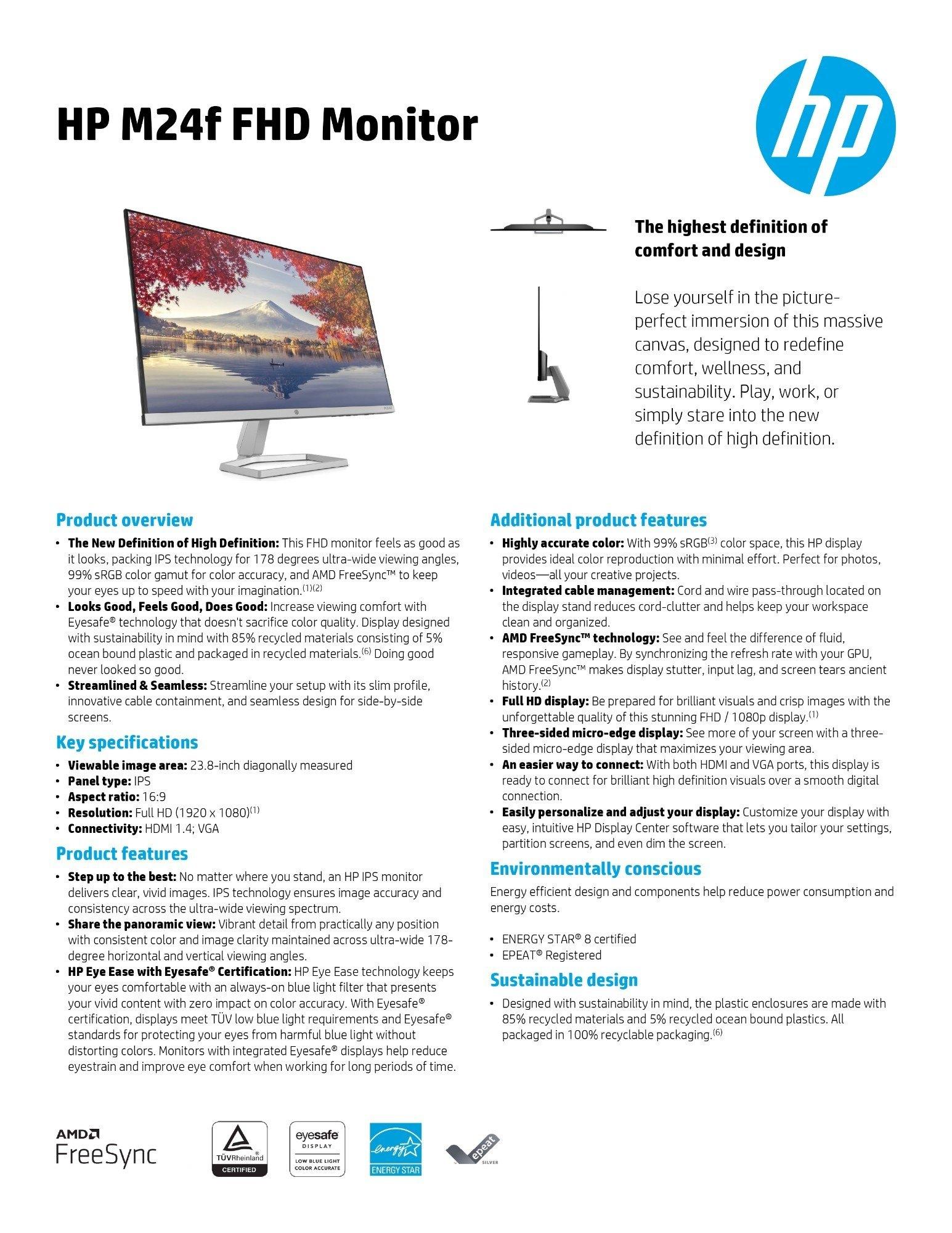 In today’s digital-first era, the HP M24f is a game-changer, offering a larger screen for efficient multitasking, enhanced visuals for streaming or gaming, and ergonomic comfort for long work or study sessions, making it essential for productivity and well-being.Its ultraslim design with micro-edge bezels saves desk space and looks stunning in any setup. The tilt-adjustable stand and Eyesafe® low blue light technology ensure comfort during long usage, while HDMI and VGA ports provide versatile connectivity.