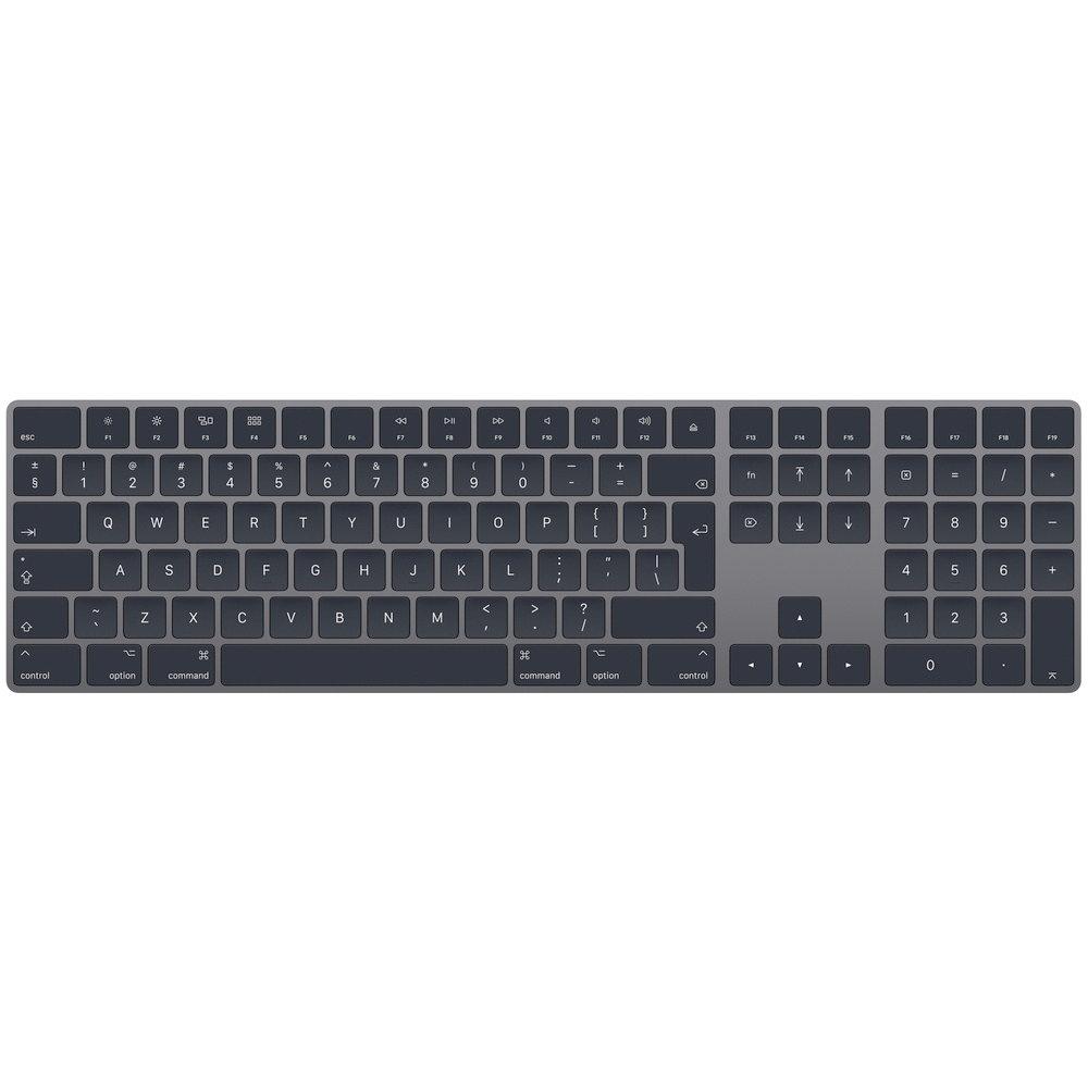 Sleek Space Gray Magic Keyboard with Numeric Keypad and Eject key—perfect for spreadsheets, accounting, and shortcuts. Pairs instantly via Bluetooth, recharges with the included cable, and delivers about a month or more of battery life per charge. Low-profile scissor keys keep typing quiet, precise, and comfortable for all-day work.Connectivity: Bluetooth; charging/pairing via Lightning port (cable included; connector type may vary by batch)
