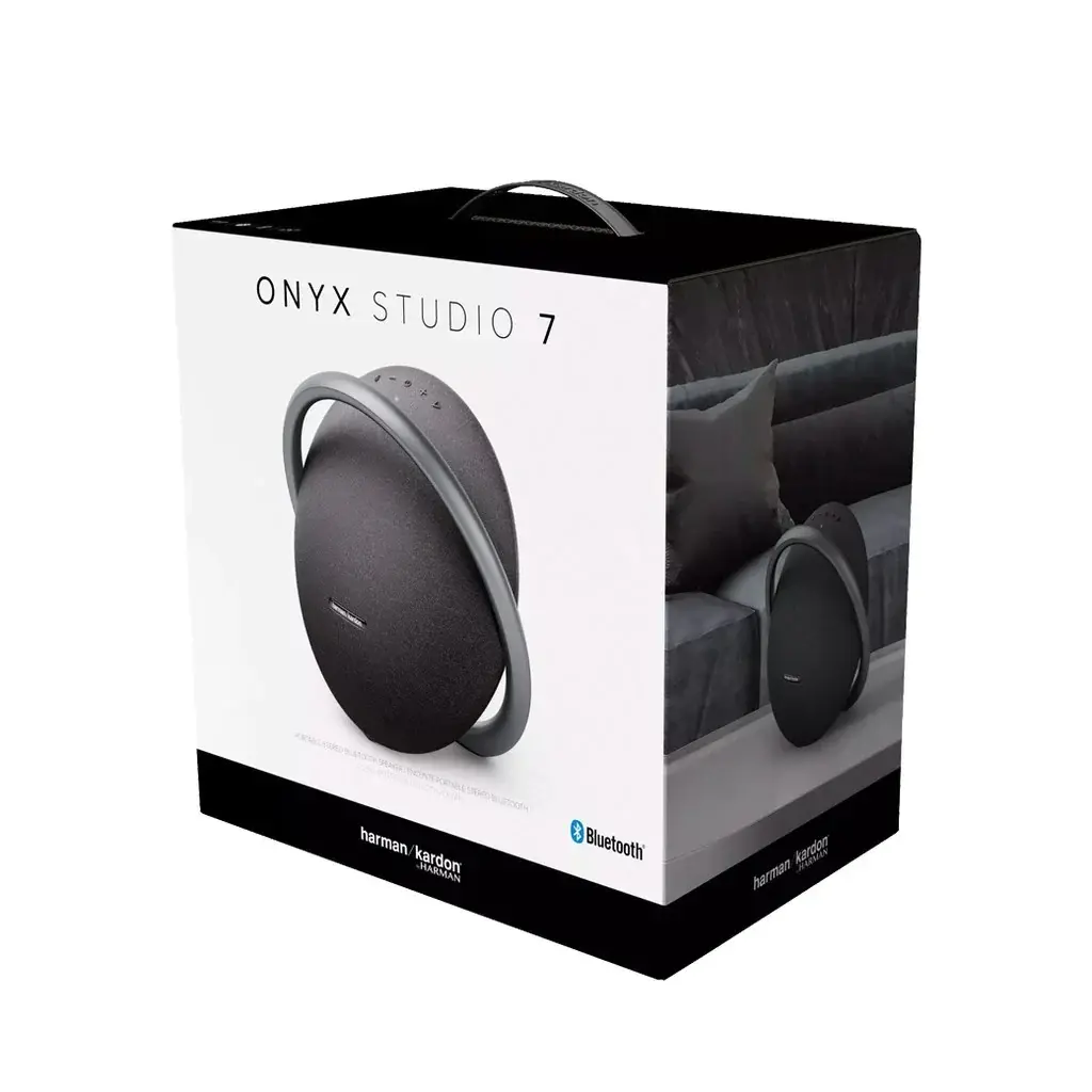 Premium portable speaker with Harman Kardon’s signature sound, dual tweeters + woofer for wider stereo, and an elegant aluminum carry handle. Enjoy up to 8 hours of playtime, USB-C charging, Bluetooth multipoint to connect two devices, and Wireless Dual Sound to pair two Onyx Studio 7 units for bigger audio. Fabric grille and robust build suit home, office, or travel.