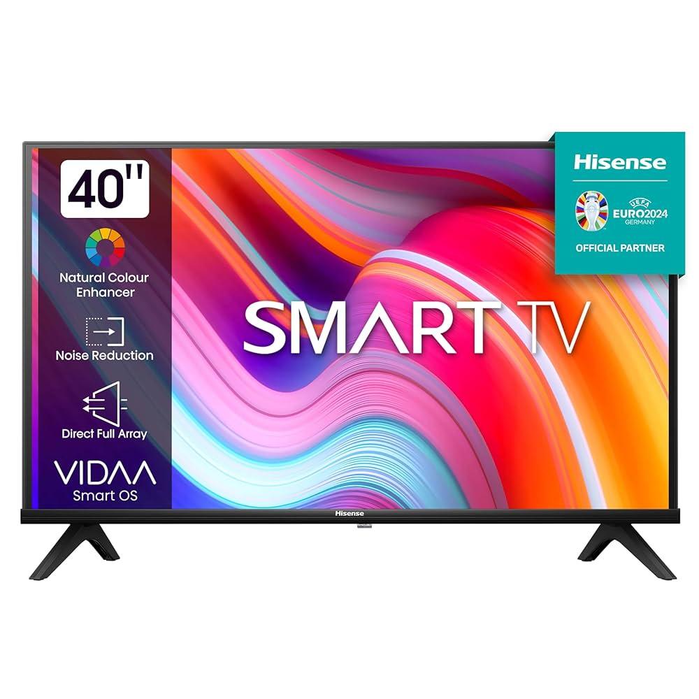 Hisense 40" A4 Series delivers crisp Full HD (1080p) viewing with a fast, easy VIDAA Smart TV experience—open YouTube, Netflix, Disney+ and more in seconds. Built-in Wi-Fi, HDMI & USB handle decoders, consoles, and media playback, while Game/Sports picture modes keep motion smooth. Slim, bezel-light design is VESA 200×200 mm wall-mount ready and fits tight spaces. Dimensions (cm): without stand 89.0 × 51.0 × 8.3, with stand 89.0 × 56.0 × 19.0; Weight: ~6.0 kg. Ideal for bedrooms, hostels, shops, and offices.