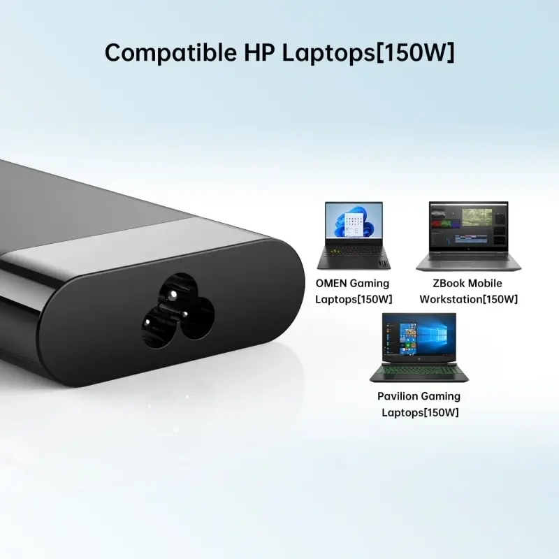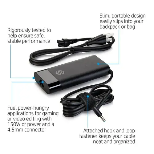 150W (19.5V ⎓ 7.7A) slim adapter with 4.5×3.0mm blue-tip connector. Auto-regulates current for safe, efficient charging and full-power operation during gaming, rendering, or compiling. Worldwide voltage (100–240V). Model family includes HP retail SKU 4SC18AA.
