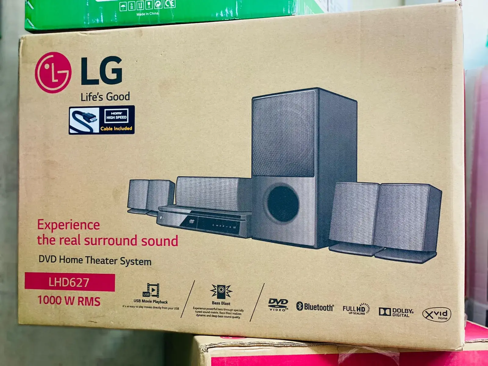 Bring cinema home with the LG LHD627—a 1000W 5.1-channel system that delivers powerful surround sound for movies, sports, music, and gaming. Enjoy Bluetooth streaming, DVD playback with 1080p upscaling, USB direct playback/recording, and simple TV hookup via HDMI or Optical In. LG’s Bass Blast+ and Dolby Digital decoding add punch and clarity, while Karaoke and FM radio keep the party going.