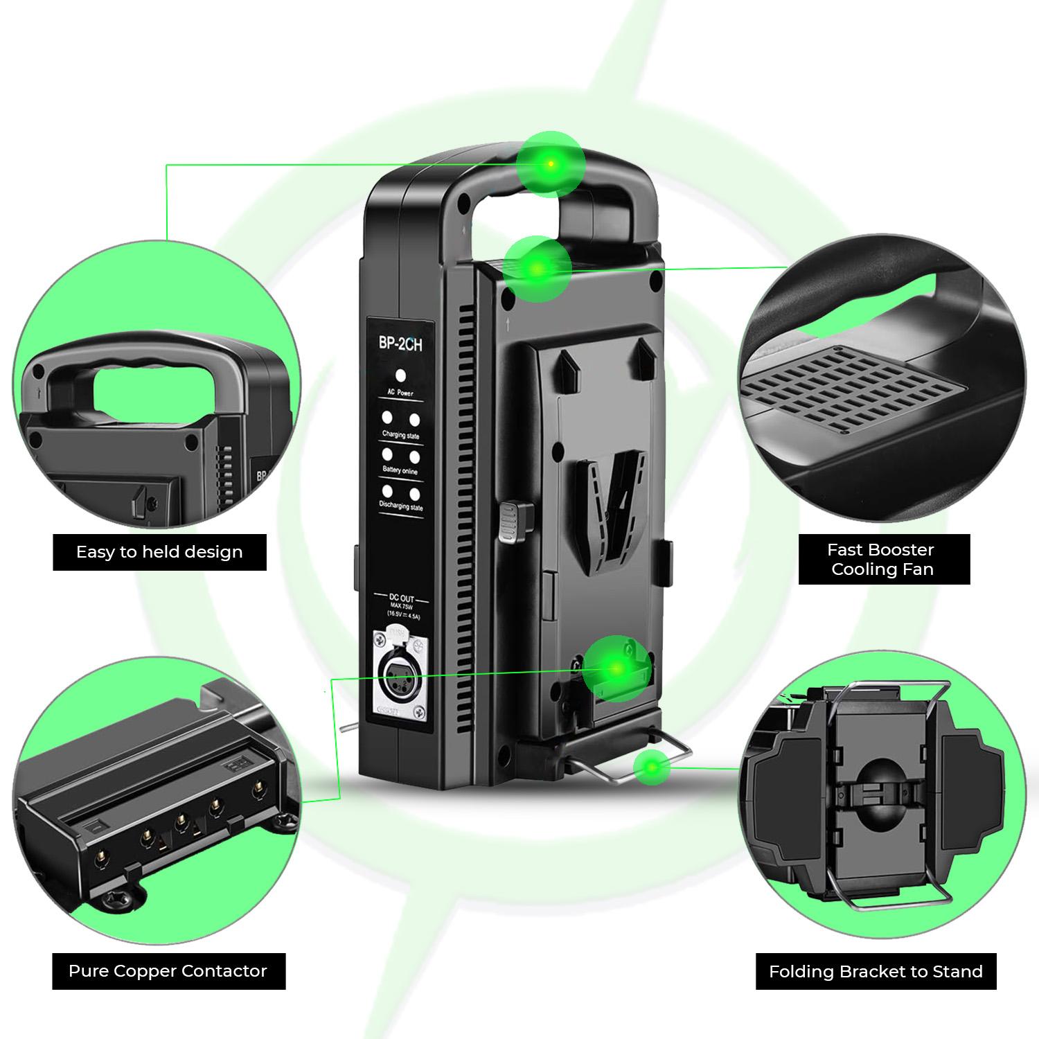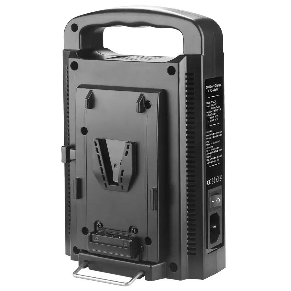 Two-Bay V-Mount/V-Lock Desktop Charger With Built-In 16.5V DC Output For Powering Or Recharging Camera Rigs And LED Lights (Batteries Not Included).