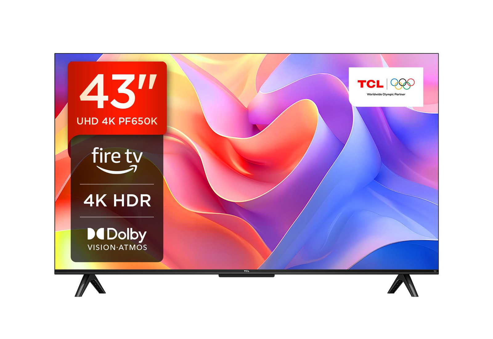 43-inch 4K UHD Fire TV with Dolby Vision and HDR10 for brighter, richer movies and sports. Alexa built-in for hands-free search and control, plus AirPlay 2 and Miracast for quick casting. Connect soundbars via HDMI eARC or Bluetooth; stream over dual-band Wi-Fi. Slim bezel design with multiple HDMI & USB ports and Free-To-Air tuner (region dependent). Approx. size (without stand): 96.3 × 56.0 × 8.6 cm; with stand: 96.3 × 61.0 × 24.5 cm; Weight: ~7.4 kg; VESA: 200 × 200 mm.